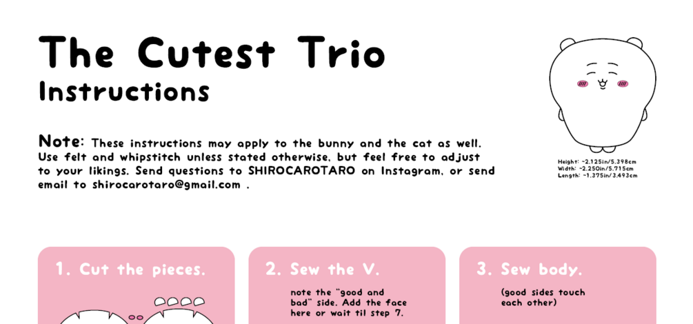 This design is a fan creation inspired by the charm of small, round, and expressive characters. It is not affiliated with or endorsed by any official creators or brands. This plush template is meant for educational purposes! Do not reproduce, freely distribute, sell this pattern, nor sell the modified versions of this pattern. Please credit with "Pattern by SHIROCAROTARO". If you modified the pattern, give credit with "Modified from SHIROCAROTARO's template".